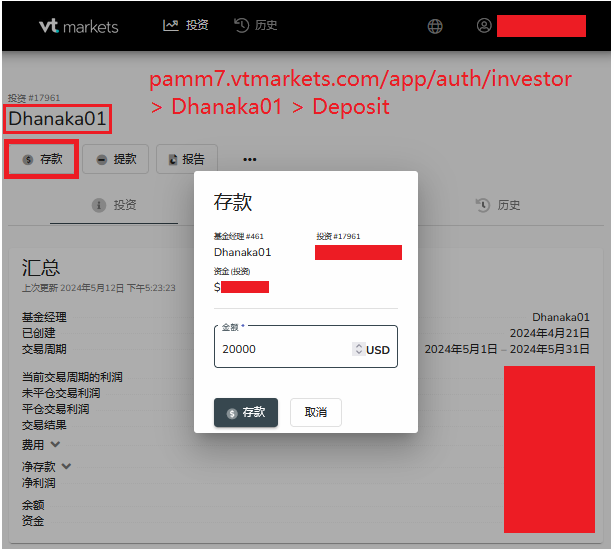 登录后,请点击 "Dhanaka01" (如果没看到就跳过) > 点击 "存款"。请确保您在客户端 (步骤 B4) 的 "类型" = "PAMM" 的账户已经有足够的资金,然后您只需在 pamm7.vtmarkets.com/app/auth/investor > "存款" 内输入再投资的金额。随后,您的客户端内 "类型" = "PAMM" 的帐户 (步骤 C2) 应该会显示零 (0.00 美元)。
