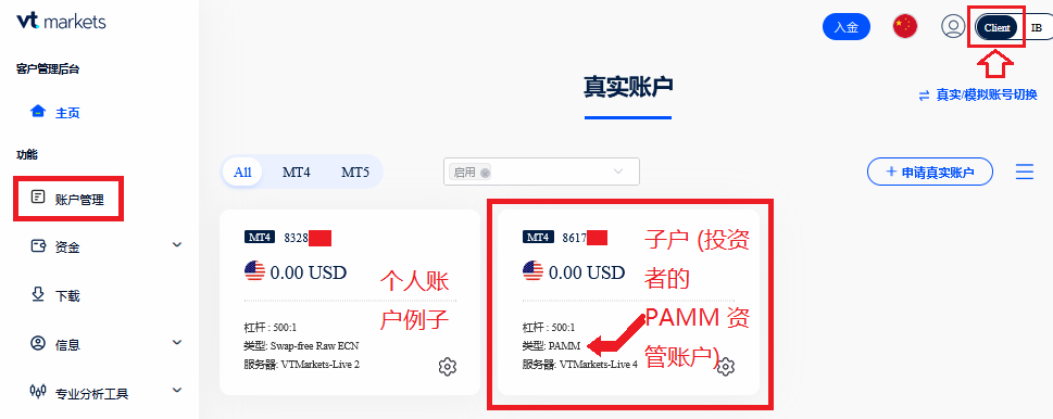 请注意,我们批准您的出金申请后,您的出金款项将显示在您的客户端的 "类型" = "PAMM" 账户内 (myaccount.vtmarkets.com/login