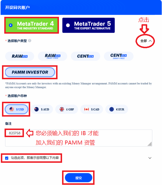 : MetaTrader4 (MT4)、PAMM Investor (子户)、$ USD (美元) 和在备注输入